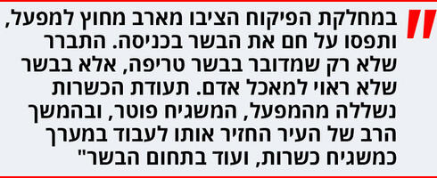 הכאב הוכפל כאשר מ' גילה שאותו מפקח, משלים לדבריו השלמת הכנסה כמשגיח כשרות בסופרמרקט באזור אחר בעיר. "הוא נמצא שם ומקבל שכר, על חשבון השעות שבהן הוא אמור לעבוד כמפקח", אומר מ'.
