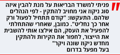 "הקמנו את המפעל לפני שש שנים וידענו שיש דרישות מחמירות, אבל היינו חייבים רישיון יצרן ובשום שלב לא הבנו בדיוק מה אנחנו חייבים. יש אינסוף דרישות שלא שייכות לכלום. לא משנה שעובדות אצלנו רק נשים, אנחנו חייבים תאי שירותים נפרדים לגברים, אבל זה רק סמלי. היו כל מיני תקנים בקשר לצינורות המים למרות ומערכת זרימה חוזרת שלא היה לנו מושג מה זה אומר ואיך זה קשור אלינו, כי אין לנו צינורות מים במפעל. חוץ מזה חויבנו בחדר שטיפת כלים ואם אתה רוצה פטור מזה, כי אתה לא משתמש במים, אתה צריך עשרות טפסים וחתימת הרשות המקומית ואתה מתייאש מראש ומשלם למאכער הנכון כדי שיאשרו לך את זה".
