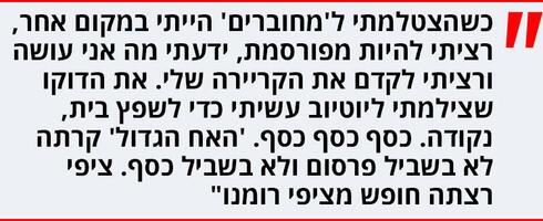 "כשהצטלמתי ל'מחוברים' לפני שש שנים הייתי במקום אחר, רציתי להיות מפורסמת. ואני לא מתביישת, זה בסדר לרצות פרסום ולרצות לעשות כסף. את הדוקו שצילמתי ליוטיוב עשיתי כדי לשפץ בית, נקודה. כסף כסף כסף".