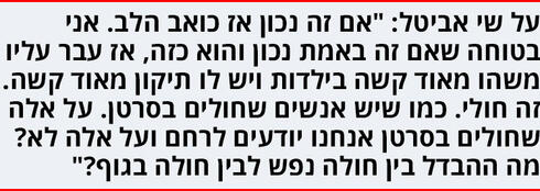 "אם זה נכון אז כואב הלב. אני בטוחה שאם זה באמת נכון והוא כזה, אז עבר עליו משהו מאוד קשה בילדות ויש לו תיקון מאוד קשה. אם זה נכון. זה חולי. כמו שיש אנשים שחולים בסרטן. על אלה שחולים בסרטן אנחנו יודעים לרחם ועל אלה לא? מה ההבדל בין חולה נפש לבין חולה בגוף? למה אנחנו חומלים על חולים בגוף ולא חומלים על חולים בנפש? לא שאני אומרת שהוא כזה".