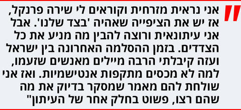 הזהות היהודית והחיבור לישראל הוא לא תמיד מתנה, בטח כשאת עובדת בעיתון החשוב בעולם וכל מילה עשויה להצית חשד להטיה שמאלנית קיצונית בואכה אוטו־אנטישמיות – לא האשמות שזרות לפרנקל. "זה באמת מאתגר", היא אומרת, "אני נראית מזרחית וקוראים לי שירה פרנקל, אז יש את הציפייה הזאת שתהיי 'בצד שלנו'. ואני תמיד עונה: אני עיתונאית ורוצה להבין מה מניע את כל הצדדים. כשחברים ומשפחה שואלים על נקודה או דעה מסוימת בכתבה, אני אומרת: זה הצד שלהם והתפקיד שלי הוא לחקור את כל הצדדים.