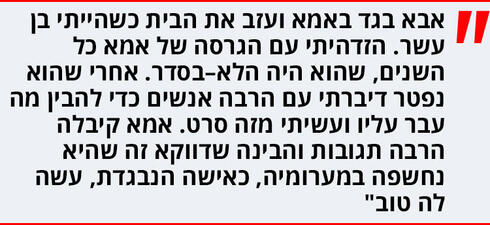 “אמא הייתה שמרנית קצת, אבל ברגע שראיתי אותה מקבלת אותם זה נתן לי את הביטחון שהיא תקבל גם אותי. אתה מפחד שיגידו ‘צא מהבית’ או ‘לא רוצים אותך’, אבל כשראיתי שאמא שלי ושמואל כל כך אהבו אותם, זה נתן לי את הביטחון שכשאצא מהארון יקבלו אותי, ובאמת ככה היה”.