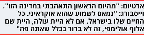 וייסבורג: "נמאס לשמוע שהוא אוקראיני, כי הוא ישראלי. כל החברים שלו פה, החיים שלו בישראל. אם לא היית עולה, היית שם אלוף אולימפי, זה לא מובן מאליו בכלל".