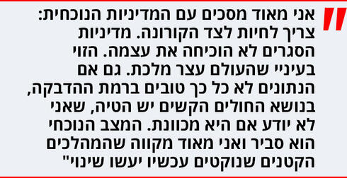 "אני מאוד מסכים עם המדיניות הנוכחית: צריך לחיות לצד הקורונה. הצד הסוציאלי־חברתי־כלכלי חשוב לא פחות מהמגפה. מדיניות הסגרים לא הוכיחה את עצמה. הזוי בעיניי שהעולם עצר מלכת. גם אם הנתונים לא כל כך טובים ברמת ההדבקה, בנושא החולים הקשים יש הטיה, שאני לא יודע אם היא מכוונת. היא נובעת משינוי הפרמטרים לתחלואה, ומגדילה את מספר החולים האלה. המצב הנוכחי הוא סביר ואני מאוד מקווה שהמהלכים הקטנים שנוקטים עכשיו יעשו שינוי, ומה שקרה באנגליה יקרה גם פה".