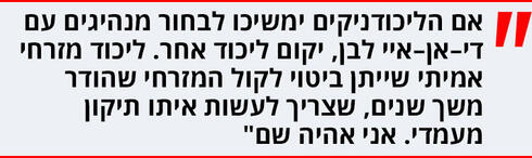 "הליכוד יצטרך לשנות את האיזון בין האשכנזים למזרחים. הליכודניקים יצטרכו לבחור יותר אנשים במעמד ביניים ומוצא שמייצגים אותם. כי אם, ותקשיב למה שאני אומרת לך, אם הליכודניקים ימשיכו לבחור מנהיגים עם די־אן־איי לבן, יקום ליכוד אחר. ליכוד מזרחי אמיתי שייתן ביטוי לקול המזרחי שהודר משך שנים, שצריך לעשות איתו תיקון מעמדי".
