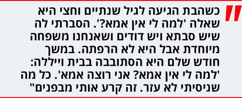 רגע קשה נוסף היה כשהבת הגיעה לגיל שנתיים וחצי ושאלה "למה לי אין אמא?". כל היועצים ממליצים להורים יחידניים להתמקד במה כן יש לנו ולא במה שאין. אז הסברתי לה שיש סבתא ויש דודים ושאנחנו משפחה מיוחדת ואיזה כיף לנו, אבל היא לא הרפתה. במשך חודש שלם היא הסתובבה בבית וייללה: "למה לי אין אמא? אני רוצה אמא". כל מה שניסיתי לא עזר. בלילות היא הייתה בוכה, וזה קרע אותי לגמרי מבפנים. יום אחד היא בכתה במיטה וחזרה על ה"למה אין לי אמא?" הזה שוב ושוב, אז שכבתי לידה ואמרתי לה: "את יודעת מה? מחר לא נלך לגן. נלך לסופר ונקנה לך אמא", והיא התפקעה מצחוק ואמרה לי: "אבל אבא, אי אפשר לקנות אמא בסופר!". אמרתי לה "אוי, את צודקת. אבא מבולבל. נלך לחנות נעליים ושם נקנה לך אמא", אז היא המשיכה לצחוק ואמרה לי "אבל אין אימהות בחנות נעליים". באותו ערב זה נגמר. פתאום נפל לה האסימון, היא הבינה שיש רק אבא והתחילה להתגאות בזה, להסתובב בגן ולהגיד "אני היחידה פה שאין לה אמא". עכשיו כבר כולם יודעים, וזה לא אישיו עבורה.