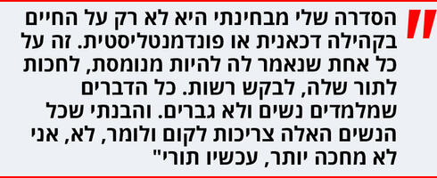 "תמיד הייתי ככה, אבל רק בראש שלי. כי נאמר לי שלהגיד מה שאני חושבת הופך אותי לבן־אדם רע. מותר לך לשאול שאלות רק בתוך סט מוגדר של אמיתות, שאין עליהן עוררין. לדוגמה, אין עוררין על כך שהמטרה שלך בחיים היא להיות רעיה ואם, וזה הדבר היחיד שאלוהים רוצה ממך. אין עוררין על כך שנשים לא צריכות ללמוד גמרא. אין עוררין על כך שאת צריכה לכסות את כולך מכף רגל ועד ראש כדי שגברים לא יתפתו. אז כל השאלות שהייתי יכולה לשאול היו שאלות שהיו מבוססות על הנחות יסוד שלא הייתי רשאית לערער עליהן, ואם עירערת — סימן שמשהו בך מאוד לא בסדר. אז בעוד שבראש שלי הייתי תמיד ישירה כמו שאני עכשיו — הייתי שקטה. יותר מ־40 שנה שמרתי הכל בפנים, עד שזה התפוצץ".