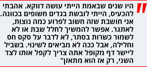 "היו שנים שבאמת הייתי עושה דווקא, מיד אחרי שעזבתי. אהבתי להכעיס, הייתי לובשת בגדים חשופים בכוונה. אני חושבת שזה חשוב לפרוע כמה נוצות, לאתגר. אפשר להמשיך לחלל שבת או לא לשמור כשרות בסתר, לא לדבר על סקס חס וחלילה, אבל ככה לא מביאים לשינוי. בשביל ליישר דף מקופל אתה צריך לקפל אותו לצד השני, רק אז הוא מתאזן. והייתי ככה המון זמן. חשוב לי, גם בשביל הילדים שלי, שיידעו שמותר להם הכול, שכל בחירה שלהם תהיה בסדר".