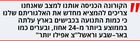"אנחנו מתקנים את זה. אולי הסתכלנו בדרך נמיר קצת יותר על נתונים היסטוריים וקצת פחות על זמן אמיתי, זאת אחת הבעיות שאנחנו מגלים עכשיו. אגב, מהירות הנסיעה הממוצעת באזור ת"א ירדה בארבעה קמ"ש בערך, יחסית למה שהיה לפני הקורונה, וזה המון".
