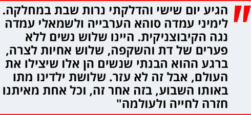 "באולטרסאונד, במהלך ההיריון, אובחן מום בלב ואמרו לי שהוא לא יחיה", מצטעפות עיניה. "הקשבתי לרופא ואמרתי 'הוא יחיה'. הבנתי את המשמעות, אמרתי שאם השם לא רוצה להעניק לו אריכות ימים זה שלו, ולא רציתי שידי תהיה במעל, במובן של הפלה יזומה. קראתי לו יוסף מפני שגם על יוסף הצדיק נאמר 'טרוף טורף'. הוא היה תינוק כחול, חולה לב, עם מד סטורציה נצחי על האצבע ואסור היה לו לבכות. בפעם היחידה שבכה הוא הוציא צעקה מרה ועצם את עיניו. לקחו אותו להדסה עין כרם, הרדימו אותו על מנת לאפשר ללב שלו להתאושש. הגיע יום שישי והדלקתי נרות שבת במחלקה. לימיני עמדה סוהא הערבייה ולשמאלי עמדה נגה הקיבוצניקית. אני עדיין מחכה שבאחת ההרצאות שלי מישהי תקום ותגיד 'זו אני'. זה היה רגע נדיר. היינו שלוש נשים ללא פערים של דת והשקפה, שלוש אחיות לצרה, ברגע ההוא הבנתי שנשים הן אלו שיצילו את העולם, אבל זה לא עזר. שלושת ילדינו מתו באותו השבוע, בזה אחר זה, וכל אחת מאיתנו חזרה לחייה ולעולמה".