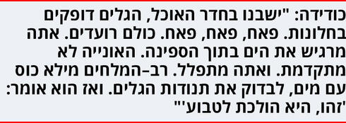 "במוצ"ש ישבנו בחדר האוכל, הגלים דופקים בחלונות. פאח, פאח, פאח", כודידה ממשיך, "אתה מרגיש את הים בתוך הספינה. האונייה לא מתקדמת. ואתה מתפלל".
