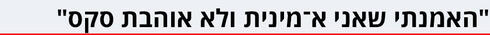 "היינו בהמון טיפולים - זוגיים, אישיים, מיניים. הלכנו אפילו לרבנים. זה לא עבד. הבנתי שזה פשוט לא זה. צריך שניים לטנגו - אם הבחורה לא נהנית מהגבר, יכול להיות שהגבר אשם, אבל יכול להיות שגם האישה לא נותנת מעצמה. 20 שנה שכבנו באותה תנוחה, וידעתי מתי מתחילים ומתי גומרים. פעם אמרתי לו בצחוק שיעיר אותי כשזה נגמר".