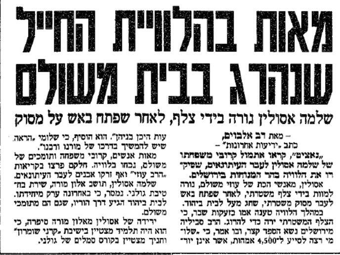 "גיסי צעק 'תביאו דלת'. גררתי דלת לבנה שהייתה שם ויחד עם יחיאל בן אבו, הפצוע הראשון, שהיה חובש קרבי בצבא, משכנו אותו על הדלת הזאת. את החרחורים שלו לא ניתן לתאר. חרחורים אחרונים. הגוף שלנו היה ספוג בדם של שלומי. שני חבר'ה לא חמושים באו לגרור אותו לבית הקשיש. אני זוכר את זה. כל הזמן הזה אבא שלו, משה, היה על הגג ולא ידע מה קרה. משכנו את הזמן בסיפורים עד אותו יום בצהריים, אז הגיעו אנשים להודיע לו ששלומי מת".