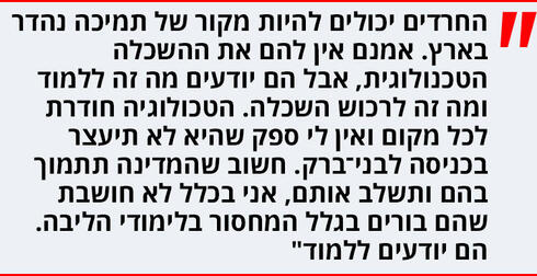 "זה בהחלט מטריד שרק צעירים מהמרכז שעברו ב־8200 מגיעים להיי־טק, ואין לי מושג איך פורצים את זה, אבל אני כן יכולה לשתף אותך במה שאני עושה כדי לשנות את זה. בעיניי, העלייה החדשה שתבוא לישראל עכשיו כדי להעשיר אותנו היא החרדים", היא מצביעה אל עבר בני־ברק הצפופה כקופסת לגו, הנשקפת מבעד לחלון של חדר הישיבות בקומה ה־35.