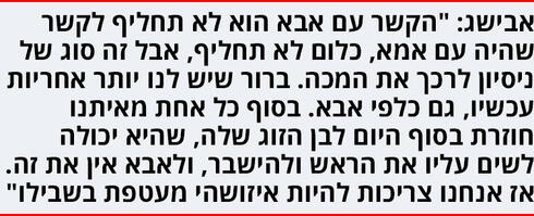 אבישג: "הקשר עם אבא הוא לא תחליף לקשר שהיה עם אמא, כלום לא תחליף, אבל זה סוג של ניסיון לרכך את המכה. כן לתת מענה לדברים שכבר לא קיימים. וכן, ברור שיש לנו יותר אחריות עכשיו, גם כלפי אבא. בסוף כל אחת מאיתנו חוזרת בסוף היום לבן הזוג שלה, שהיא יכולה לשים עליו את הראש ולהישבר, ולאבא אין את זה. אז אנחנו צריכות להיות איזושהי מעטפת בשבילו, שלא היינו לפני".