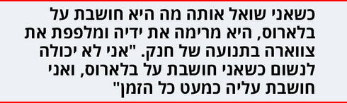 היא משלבת את אצבעותיה על מרום בטנה בערגה ועוצמת את העיניים, ואז מרימה את ידיה ומלפפת את צווארה בתנועת של חנק. "אני לא יכולה לנשום כשאני חושבת על בלארוס, ואני חושבת עליה כמעט כל הזמן".