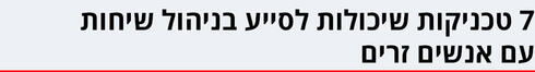 {"type":"image","data":{"imageId":"ArticleImageData.5998429~10931865","url":"https://ynet-pic1.yit.co.il/picserver5/crop_images/2021/09/09/10931865/10931865_0_0_640_360_0_large.jpg","caption":"","credit":"צילום: Shutterstock"}}אתם יוצאים בהפסקת הצהריים לפארק קטן, מקום ציבורי שבו אנשים שונים נחים. הנורמה נגד דיבור עם זרים פחות דומיננטית במקומות כאלה. אתם נמצאים אולי ליד אדם מקבוצה חברתית אחרת, אולי בצבע אחר, אולי מבוגר יותר, או מוגבל. מה שלא יהיה, אתם מעט מתוחים. אתם דואגים שזה אולי ילך גרוע, שתגידו את הדבר הלא נכון, או שהם ידחו אתכם. הפחדים האלה טבעיים לגמרי. חפשו משהו משותף. אם אתם מסתכלים על אותו דבר או חווים משהו דומה, זה יוצר "אנחנו" קטן, קשר קטן. הקשיבו היטב, צרו קשר עין, צפו בשפת הגוף. תנו לשיחה ללכת לאן שהיא הולכת. תנו לה להפתיע אתכם. אם זה ממש הולך טוב, אולי תבקשו עצה על משהו. זה ייתן עוד מידע על האדם ואולי יפתור לכם בעיה. סיימו את השיחה בנעימות וחשבו איך ציפיתם שהאינטראקציה תהיה ואיך היא הייתה באמת. אולי תרגישו פחות מתוחים בפעמים הבאות. אולי הניסוי משאיר אתכם עם השקפה חיובית יותר על הקבוצה שממנה בא האדם. שניכם למדתם משהו קטן על איך החיים אצל האחר, והחיים שלכם לכן עשירים יותר.