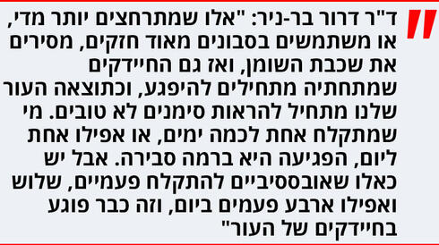 "כשיש תקופה כזו כמו עכשיו, שיש בה חוסר במגע אצל אנשים שחוששים להתחבק או לא יכולים, זה מאוד חשוב לעבוד על חיזוק מערכת החיסון ובמקביל על הורדת הסטרס והצורך במגע. אז אפשר לשים את הרגליים בתוך דלי עם מים קרים, אפילו עם קצת קרח, לעד חמש דקות ואז לעבור למים חמים. זה יכול לעזור לאנשים להירגע, ועל הדרך לשפר את המערכת החיסונית".