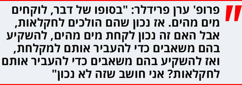 "בסופו של דבר לוקחים מים מהים. אז נכון שהם הולכים לחקלאות, אבל האם זה נכון לקחת מים מהים, להשקיע בהם משאבים כדי להעביר אותם למקלחת ואז להשקיע בהם משאבים כדי להעביר אותם לחקלאות? אני חושב שזה לא נכון. כמובן שזה טוב שמשתמשים בהם, ולשמחתנו ישראל מובילה בעולם בנושא של מחזור מים לחקלאות, כי אנחנו סובלים ממחסור במים החל משנות ה-70 וה-80 ואילו שאר העולם רק עכשיו מתחיל להיכנס לזה. אבל גם עם הפתרונות שיש לנו, זה עדיין לא מספיק. זה מה שנקרא 'גרין ווש' – זה להראות כאילו אתה ירוק".