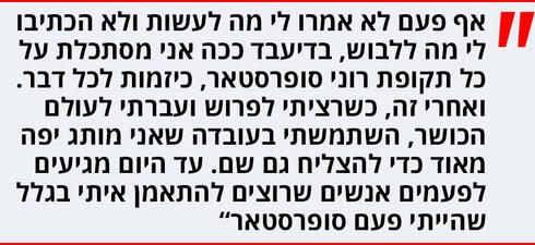 “לא הפסיקו להגיד עליי שאני רק מוצר יפה. אז כן, נשמות, אני מוצר ומוצר מאוד יפה, ומוצלח וטוב לי. יודעת מה, אני מוצר שגאה במוצריותו. אף פעם לא הייתי בובה של אף אחד, מצטערת לאכזב, לא אמרו לי מה לעשות ולא הכתיבו לי מה ללבוש, בדיעבד ככה אני מסתכלת על כל תקופת רוני סופרסטאר, כיזמות לכל דבר. ואחרי זה, כשרציתי לפרוש ועברתי לעולם הכושר, השתמשתי בעובדה שאני מותג יפה מאוד כדי להצליח גם שם. עד היום מגיעים לפעמים אנשים שרוצים להתאמן איתי בגלל שהייתי פעם סופרסטאר, אני תמיד מזהה אותם. הם מגיעים מרחוק מאוד, לא מתל־אביב, ומתרגשים מאוד”.