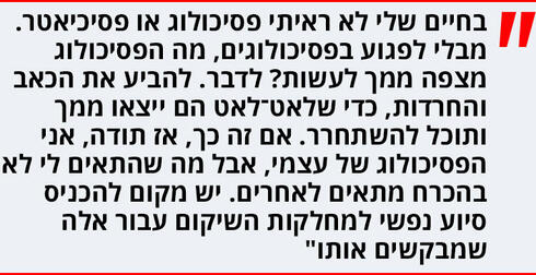 "לא. בחיים שלי לא ראיתי פסיכולוג או פסיכיאטר. מבלי לפגוע בפסיכולוגים, מה הפסיכולוג מצפה ממך לעשות? לדבר. להביע את הכאב והחרדות, כדי שלאט־לאט הם ייצאו ממך ותוכל להשתחרר. אם זה כך, אז תודה, אני הפסיכולוג של עצמי, אבל מה שהתאים לי לא בהכרח מתאים לאחרים. יש מקום להכניס סיוע נפשי למחלקות השיקום עבור אלה שמבקשים אותו".