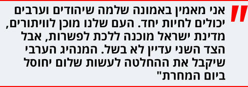 "הלוואי שלא, אבל לדעתי כן. אני לא רואה מצב אחר בעתיד הקרוב. אני ימני בדעותיי ואני לא נמנה עם הקיצונים. נפגשתי עם ערפאת פעמיים, הוא ממש התאהב בי ושלח לי עוגה ליום הולדת, אבו־מאזן התארח אצלי בבית, אבל הבעיה היא לא השלום בין העמים. על הסכם השלום אפשר לחתום מחר. אני מאמין באמונה שלמה שיהודים וערבים יכולים לחיות יחד. גדלתי בנס־ציונה, מאחורינו הייתה שכונה ערבית, והחבר הכי טוב שלי, בגיל ארבע, היה מחמוד. כל יום שיחקנו בחצר. העם שלנו מוכן לוויתורים, מדינת ישראל מוכנה ללכת לפשרות, אבל הצד השני עדיין לא בשל. המנהיג הערבי שיקבל את ההחלטה לעשות שלום יחוסל ביום המחרת".