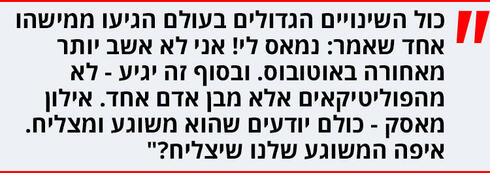 "מרגיז אותי שאנחנו מוותרים ואומרים 'טוב, זה ישראל'. תשאל מה אני יכול לעשות כדי לשנות את זה. כל השינויים הגדולים בעולם הגיעו ממישהו אחד שאמר: נמאס לי! אני לא אשב יותר מאחורה באוטובוס. אני דורש שהרכבת תגיע בזמן. ובסוף זה יגיע - לא מהפוליטיקאים אלא מבן אדם אחד שפשוט נמאס לו ויצליח לסחוף אחריו. אילון מאסק - כולם יודעים שהוא משוגע ומצליח. איפה המשוגע שלנו שיצליח? כשיהיה לנו אותו, רכבת ישראל תגיע בזמן".