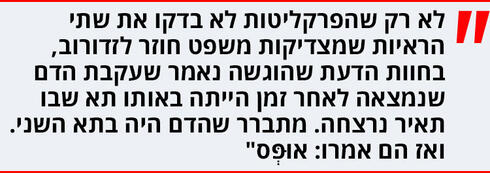 "לא רק שלא בדקו", אמר, "בחוות הדעת שהוגשה נאמר שהדם הזה היה באותו תא שבו תאיר נרצחה. מתברר שהדם היה בתא השני. ואז הם אמרו, אוּפְּס, זאת הייתה טעות של הפתולוג שכתב את הדו"ח. טעות יכולה להיות ברשלנות או בתום לב או טעות מכוונת. העובדה שהדם היה בתא השני היא דבר חדש. הפרקליטות הודתה בזה".