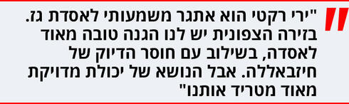"ירי רקטי הוא אתגר משמעותי לאסדה. בזירה הצפונית יש לנו הגנה טובה מאוד לאסדה, בשילוב עם חוסר הדיוק של חיזבאללה. אבל הנושא של יכולת מדויקת מאוד מטריד אותנו. זה כבר סדר גודל אחר של איום, ואת זה אנחנו צריכים למנוע בכל דרך. זו משימה אדירה.