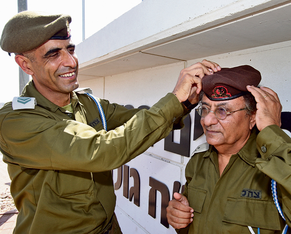 ההתחלה הייתה מאיימת משהו. לפני שהספקתי להכיר את האיש שאני אמור ללוות בשעות הקרובות, או הוא אותי, הוא שלח אותי לעלות על מדים. הכל כולל הכל, עם דרגות רס"ר, כדי שכולם יידעו שזו לא הצגה. אין לי מושג ירוק איך הם ידעו את המידות שלי, אבל זה הצליח להם, לא נראיתי שלומפר. את התמונה שלחתי מיד לבת שלי, חיילת בעצמה, שהתעקשה על שירות קרבי ככל האפשר, והיא מבינה משהו במשמעת. היא לא הבינה מה עובר על אבא שלה, הרי זה לא פורים.