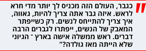 "להבין מי אני כגבר. כגבר העולם הזה מכניס לך יותר מדי חרא לראש. לגבי איזה גבר אתה צריך להיות, ולגבי גאווה, ולגבי יחס לנשים. יש תהליכים שהגברים צריכים לעבור, ומי שיכולות לעזור לנו עם זה הן הנשים. כשייפתר המאבק של הנשים, ייפתרו גם לנו הרבה דברים. ראש ממשלה אישה בארץ - זה נראה לנו הגיוני שלא הייתה מאז גולדה? כשנשים יהיו מסודרות מבחינה שוויונית, הרבה דברים ייפתרו.