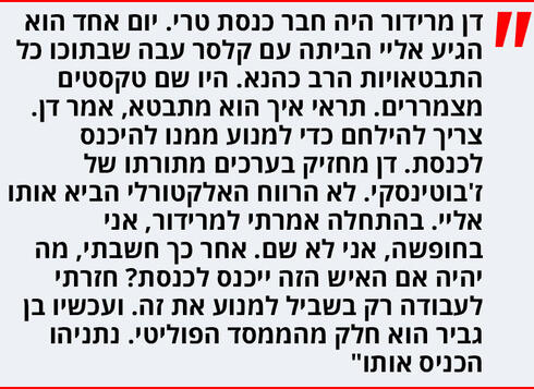 "זה לא היה כך", אמרה. "דן מרידור היה חבר כנסת טרי. לא הכרנו. יום אחד הוא הגיע אליי הביתה עם קלסר עבה שבתוכו כל התבטאויות הרב כהנא. היו שם טקסטים מצמררים. תראי איך הוא מתבטא, אמר דן. צריך להילחם כדי למנוע ממנו להיכנס לכנסת. דן מחזיק בערכים מתורתו של ז'בוטינסקי. לא הרווח האלקטורלי הביא אותו אליי".