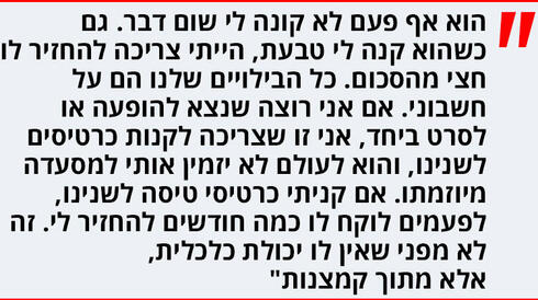 "מה שהכי מפריע לי הוא שהפכתי לאדם מתחשבן. אני נאלצת להכין רשימות של כמה הוא כסף חייב לי. אני לא אוהבת את עצמי כך. מעבר לזה, לא קיבלתי אף פעם מתנה לימי הולדת. אני לא צריכה שהוא יקנה לי תכשיטים, אבל גם אם הוא היה קוטף לי פרח זה כבר היה ממלא. אני לעומת זאת קונה לו מתנות גם בלי סיבה מיוחדת, כשאני רואה משהו שאני חושבת שהוא ירצה.