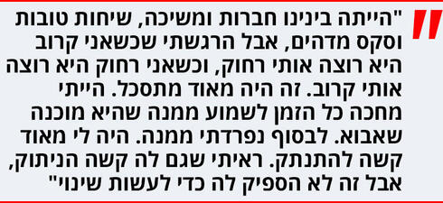 "הייתה לנו שיחה אחת שבה לא הייתי במיטבי מבחינה רגשית, לא הצלחתי להכיל או להצחיק אותו. הוא אמר לי שהוא לא מזהה אותי מפני שאני שותקת, ואז הבנתי שהוא לא מכיר אותי, הרי לפעמים אני שותקת או פורקת וגם אני צריכה את המקום שלי, רק שמעולם לא עשיתי את זה איתו. ברגע ההוא נדלקה לי נורה אדומה. הפסקתי לרצות להיות בשבילו, הפסקתי לרצות שהוא יתקשר אליי מפני שכבר לא יכולתי להכיל את הסיפורים על הפעמים שהוא שוב רב עם גרושתו, או שהוא חווה התקף חרדה".