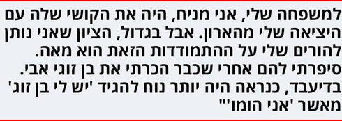 "למשפחה שלי, אני מניח, היה את הקושי שלה. אבל לא היו דרמות של הכחשה או סירוב לקבל את המציאות. בגדול, הציון שאני נותן להורים שלי על ההתמודדות בעניין הזה הוא מאה. סיפרתי להם אחרי שכבר הכרתי את אבי. בדיעבד, כנראה היה יותר נוח להגיד 'יש לי בן זוג' מאשר 'אני הומו'. היציאה שלי מהארון בפני עצמי הייתה יותר קשה. הייתה תקופה בהתבגרות שלי, שבאמת חשבתי שנידונתי לחיי בדידות אינסופית, שאיאלץ לעבור לארץ אחרת, לעזוב את כל החברים שלי, את המשפחה. גדלתי במקום מאוד גברי. מאוד הומופובי. פריפריה. רחוק מתל־אביב. גדלתי בתחושה שאהיה 'הקללה'. המילה שמקללים במשחקי כדורגל".