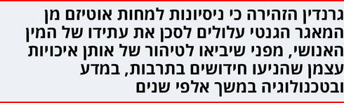היא הזהירה כי ניסיונות למחות אוטיזם מן המאגר הגנטי עלולים לסכן את עתידו של המין האנושי, מפני שיביאו לטיהור של אותן איכויות עצמן שהניעו חידושים בתרבות, במדע ובטכנולוגיה במשך אלפי שנים. היוצר של חנית האבן הראשונה, היא אמרה, היה קרוב לוודאי אוטיסט בודד בירכתי מערה, שקוע בהבדלים העדינים בין סוגים שונים של סלעים - לא אחד מן ה"בּרבּרנים" שמפטפטים להם באור המדורה.