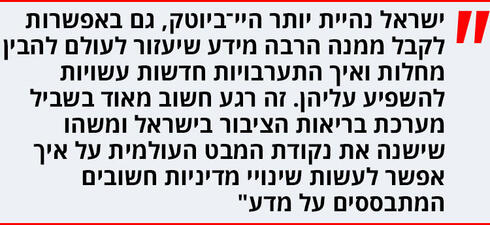 "אני מניח שהוא התכון לזה באופן חיובי. הרעיון הוא שאם יש לך בעיית בריאות בישראל אתה יכול להשתמש במערכת הבריאות כדי לבחון אותה מהר, להתערב ולהראות את התוצאות. זה נפלא, אבל. אני מבין שזה שנוי במחלוקת. בארה”ב אנחנו נלחמים על החיסונים כי אין לנו מידע טוב כמו בישראל. הלוואי שיכולנו לעשות את זה כאן".