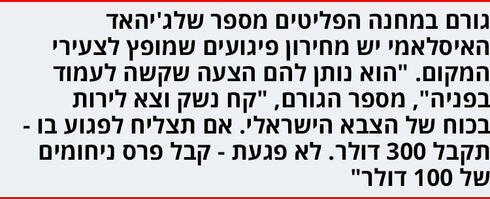 גורם במחנה מספר שלג'יהאד האיסלאמי יש מחירון פיגועים שמופץ לצעירי המקום. "הוא נותן להם הצעה שקשה להם לעמוד בפניה", מספר הגורם, "קח נשק וצא לירות בכוח של הצבא הישראלי. אם תצליח לפגוע בו - תקבל 300 דולר. לא פגעת - קבל פרס ניחומים של 100 דולר".