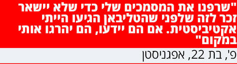 "הטליבאן חושבים שאם עבדת במשרדי הממשלה או עם גופים זרים אתה מרגל או בוגד. חמותה של חברה שלי, עבדה גם במשרד ממשלתי. יום אחד הם פרצו לביתה, התחילו לחטט לה בכל המסמכים, הפכו לה את כל הבית, הכו אותה קשות. בעלי ביקש שאעזוב את הבית שלנו ואעבור לגור עם אמי עם הילדים ושלא אצא מהבית לתקופה מסוימת. אנחנו מאוד חוששים שיום אחד יגיעו גם אליי. ביום השלישי אחרי שהטליבאן השתלטו על קאבול הלכתי עם הבן שלי, לבושה כולי בשחור כמובן, כדי לנסות לקחת את התיקייה הזו, רק שידם לא תגיע אל המסמכים הללו, אבל לא נתנו לי להיכנס. בניסיון הראשון להיכנס שם, הבחור שעמד בכניסה למבנה החל לחבוט בי עם מקל ארוך. שוב ושוב. הבן הקטן שלי כל כך נבהל והתחיל לצרוח ולבכות. זה היה נורא. אם את אישה באפגניסטן - את כלום.