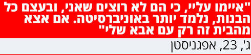 אם רק היה לה מספיק כסף, ג' הייתה בורחת. "לא יכולתי לעזוב את המדינה הזאת כדי להמשיך את חיי באושר", היא אומרת עכשיו בהשלמה כואבת. "יותר מ־40 יום אין לנו יום שמח. איננו יכולות לנשום בקלות, אנו חשות סכנה כל רגע, כל שנייה, ונראה כי אנו הולכות אחורה. אין לנו לאן להתקדם, אין לנו איך לרכוש השכלה ואסור לנו לעבוד. מה יהיה איתי? מה יהיה עם כל השנים שלמדתי באוניברסיטה? מה עם כל מה שכבר הספקתי ללמוד? זו הייתה השנה השלישית שלי ונותרה לי שנה אחת לתואר".