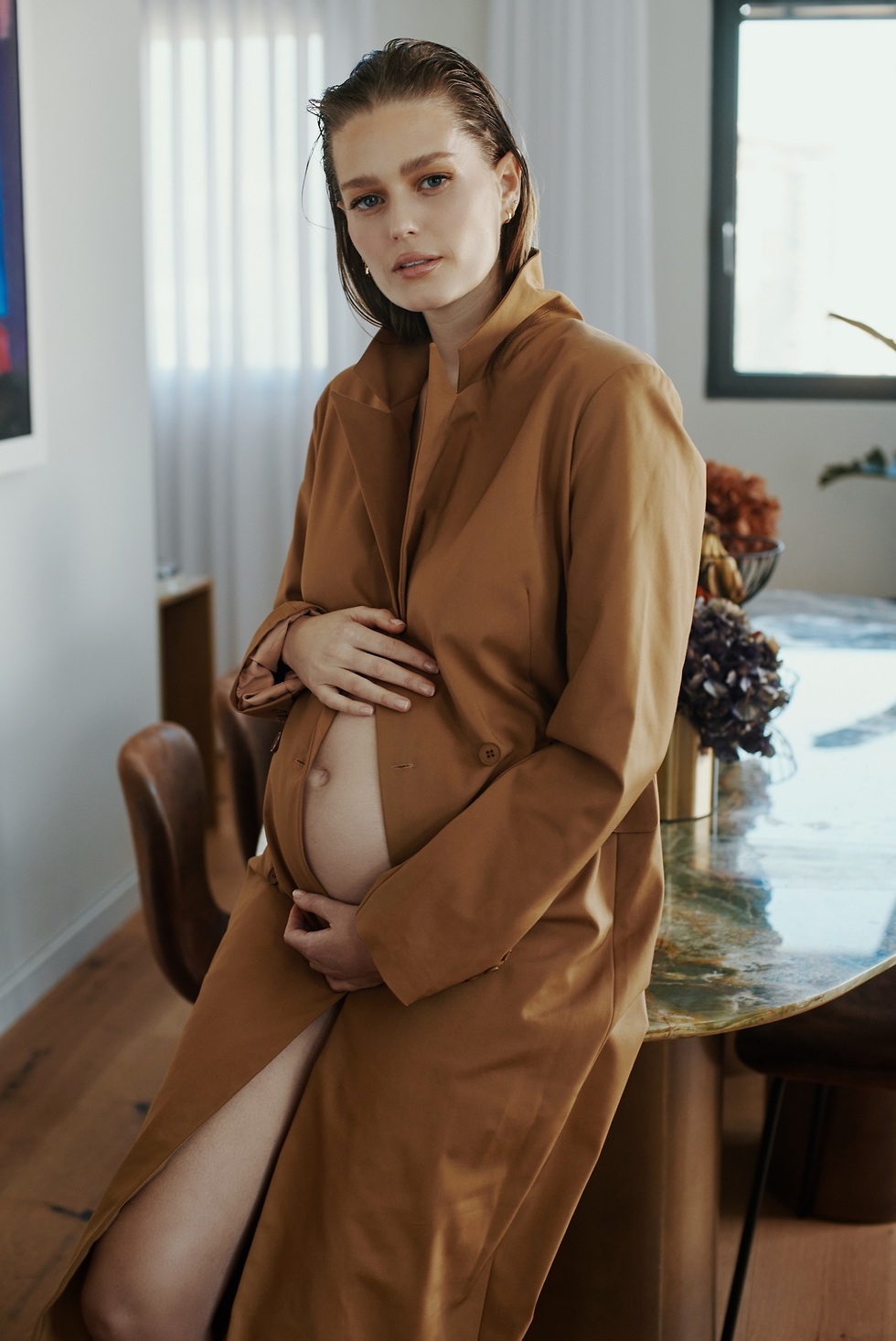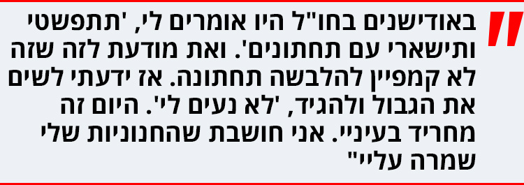 "גם אם ארצה להיות שנה בבית - אמצא את המקום שלי בתוך העולם הזה. אבל היו רגעים בקריירה שחוויתי כאפה של 'אוקיי, אולי זה לא סבבה להיכנס להיריון?' בהיריון הראשון הלכתי למדידות לפני צילומים, זה היה בשלב שלא מספרים, ממש בהתחלה, והבחורה שמדדה אותי ראתה שהשתנה לי הגוף, שהשתנה לי החזה. היא לא אמרה לי כלום אבל היא אמרה את זה לבעלים של המותג והוא התקשר לסוכן שלי ואמר לו, 'אני יודע שהיא בהיריון, אי־אפשר לטעות, השינויים שלה בגוף מאוד נשיים. אם היא בהיריון אנחנו לא יכולים לקחת אותה לצילומים. אנחנו רק רוצים לדעת'. עמדתי בסיטואציה שאני מול לקוח וחייבת לספר לו כי הצמידו אותי לקיר.