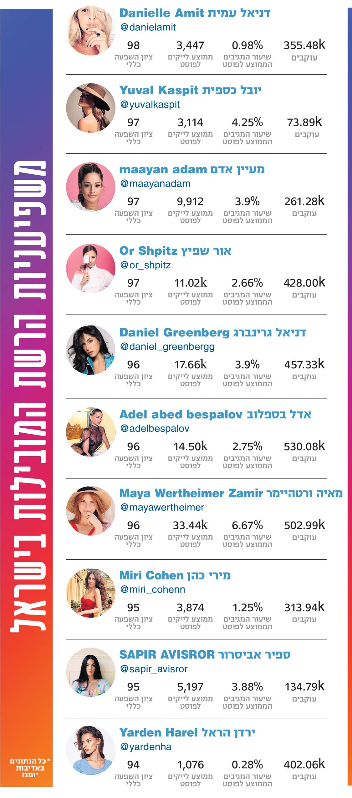 השוק הזה צומח בקצב מטורף: בשנת 2022 יגלגלו משפיעני הרשת בישראל סכום של 59 מיליון דולר. לפי התחזיות ב־2026 ייחצה רף מאה מיליון הדולרים. משפיעניות כמו ספיר אביסרור עם 135 אלף העוקבים שלה או יובל כספית שסוחפת אחריה קהילה נאמנה של 73 אלף עוקבים — הפכו לשמות שמותגי אופנה, לייף־סטייל, מזון ונופש לא יכולים להתעלם מהן בתהליך בניית הקמפיין. כן, עבור רבים מהקוראים אביסרור, כספית או שמות של משפיעניות בולטות אחרות כמו מאיה נרקיס, דניאלה אייפנברג ומאי כהן לא אומרים הרבה. אבל עבור המותגים הבולטים בישראל הן שמות שמתגלגלים על הפה בכל ישיבה שעוסקת בשיווק ופרסום. לכל אחת מהמשפיעניות הללו עשרות אלפי עוקבים, ולעיתים מעל למאה אלף — שלא מפספסים אף פוסט ובסבירות גבוהה יקנו את המוצרים שאביסרור ושות' ימליצו עליהם באינסטגרם. אביסרור, למשל, מכרה תוך 24 שעות 4,000 פריטים של אחד ממותגי האופנה ואייפנברג "העיפה" 750 פריטים בשעה! עבור המשפיעניות המובילות מדובר במקור הכנסה חודשית של עשרות אלפי שקלים רק דרך שיווק מוצרים ברשת.