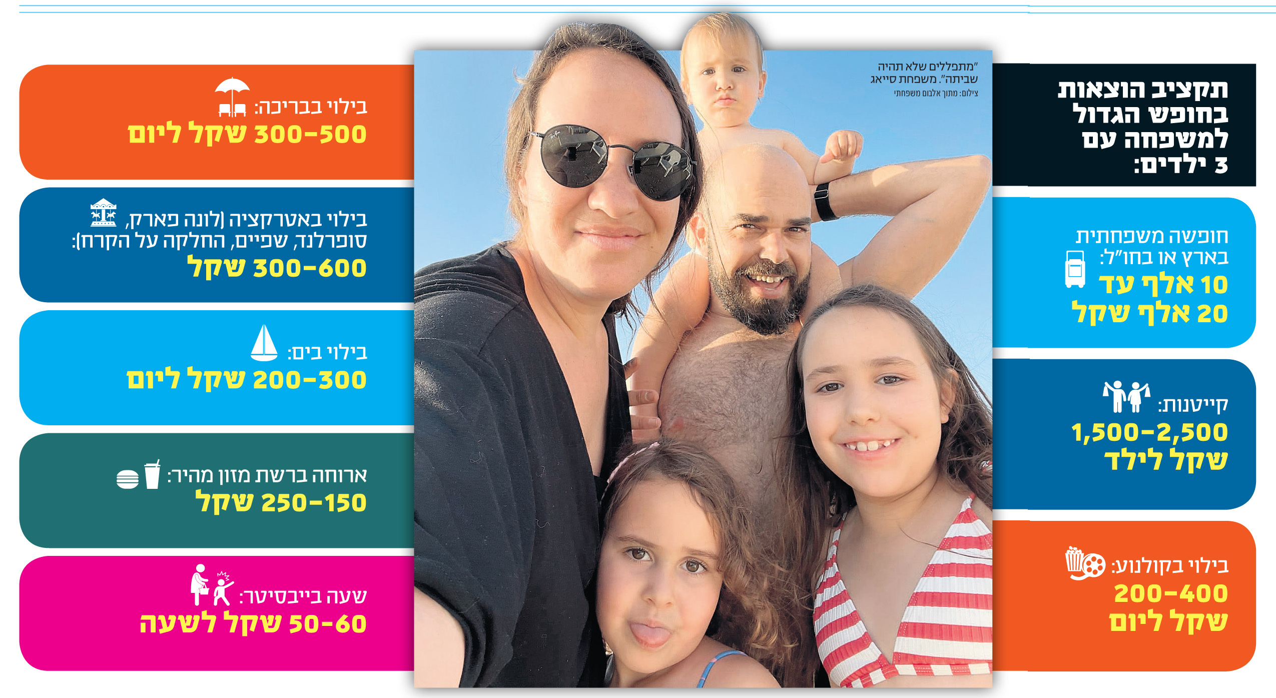 "זה פשוט לא נגמר", אומרת ירדן סייאג ממושב ינוב, נשואה לניב, עצמאי בעל חנות בענף הסלולר, ואם לשלושה: אביב בת ה־9, גאיה בת ה־6 שעולה לכיתה א' ובר בן השנה וחצי, שילך השנה לראשונה לגן. "אין יום בחופש הגדול שלא הוצאתי לפחות 200 שקל על בזבוזים בקטנה כדי להפעיל את הילדים עם פיצה וגלידה ועד למאות שקלים ביום אם יצאנו לבלות בספארי, בפארק המים שפיים או בלונה פארק בתל־אביב. למדתי להשתמש בנקודות בכרטיס האשראי או לרכוש בהטבות דרך מועדוני חברים: קחי למשל את הלונה פארק, רכשתי כרטיסים בהנחה משמעותית ב־89 שקל, אבל עדיין רכישה של ארבעה כרטיסים (בר בן השנה וחצי פטור מתשלום), מסתכמת בהוצאה בסיסית של 356 שקל, וזה בלי כל המסביב, אוכל, שתייה, ארטיקים, דלק וחנייה, מה שמייקר אם לא מכפיל את ההוצאה. 700־800 שקל על בילוי חד־פעמי באטרקציה, כשיש חודשיים כאלה — זה לא שפוי. מזל שיש את מתחם אורבניה בקריית השרון, ששם יש פעילות לכל הילדים ואפשר לעשות כרטיסייה של 10 כניסות ב־330 שקלים במקום 40 לכרטיס".