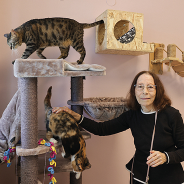 צמד החברות שושנה כדורי (77) ומרגלית מימוני (82), יושבות על אחד הספסלים שפזורים בחדר, מפטפטות, צוחקות ובעיקר מלטפות את החתולים יוסף ויובל האהובים עליהם. "אני פה בין הצעירים", מכריזה שושנה. "בעלי מבוגר יותר. עברנו לדיור מוגן בזמן הקורונה. יש לי שני ילדים וארבעה נכדים, ומאז ומתמיד אהבתי חתולים. זו החתולה של הבת שלי", היא מראה לי תמונה בטלפון. "קוראים לה בתיה, כי גידלו אותה באמבטיה. לצערי בעלי לא אוהב חיות אז לא הבאתי חיות הביתה, ופה סוף־סוף אני יכולה לממש את האהבה הגדולה שלי. הילדים שלי באים לפה הרבה, הם יותר בענייני כלבים אבל אוהבים גם לשבת איתי פה. יש פה את יובל השמן המנומר, אני מאוד אוהבת אותו והוא אוהב אותי. הוא לא יכול ללכת כי יש לו משקל עודף, ונכד של חבר שלנו פה הולך לאמץ אותו, לעזור לו בבעיית ההשמנה. פה החתולים האחרים אוכלים לו מהאוכל המיוחד".