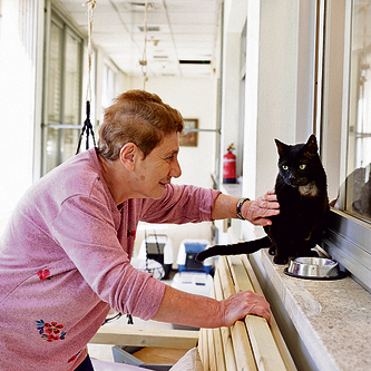 "המקום הזה הוקם מתוך מחשבה על שיקום הדדי", מסבירה בת־אל, אחראית החתולייה מטעם "תנו לחיות לחיות". "לחתולים יש יכולת טיפולית מאוד גבוהה והם מועילים במיוחד בבדידות. יש כאן חתולים חסרי בית, חלקם פצועים, חלקם דרוסים". היא מציגה אותם: "זה עבדול, הוא עיוור לגמרי. החתולה בלי הרגל היא סוויפט. זה יובל, הבעלים שלו נפטרו אחרי הרבה שנים והוא זקן ולא היה לו לאן ללכת. זה עוזי שסובל מבעיה רפואית של חתולי רחוב. וכאן זה הבית של כולם. המטרה הייתה ליצור תחושה ביתית, בשונה ממרפאה או עמותה שהחתולים מוחזקים בכלובים. פה יש סלון, יציאה למרפסת שמש נחמדה. ומשפחות שרוצות לאמץ יכולות לאמץ מפה".