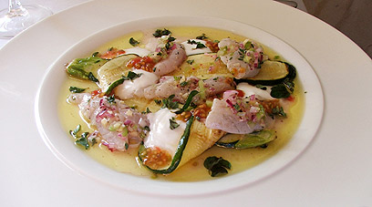 סביצ'ה דג ים, זוקיני בגריל, ג'ינג'ר וסלרי בשילוב יוגורט ואורגנו