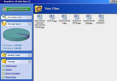 עם הזנת שם המשתמש והסיסמה שלכם ב-Gmail או בהוטמייל (תמונה מצד שמאל), יוצג על המסך חלון התוכנה ובמרכזו חלל לבן, אליו תוכלו לגרור קבצים מהמחשב - אחד אחד או כמה קבצים (הנבחרים יחד באמצעות לחיצה רציפה על כפתור העכבר או על מקש ה-Ctrl) - בחלון אחד פותחים את ה"סייר" או "המחשב שלי" - וגוררים את הקבצים אל החלון של Roam Drive.