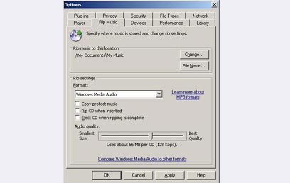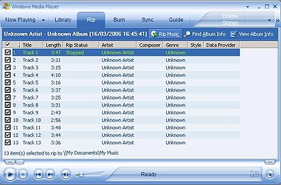 בעבר, אם רציתם להעביר מוזיקה מדיסק שרכשתם למחשב שלכם (לשימוש חוקי בלבד, כמובן), לרוב לקבצי MP3, הייתם צריכים תוכנה נפרדת. היום ניתן לעשות זאת בקלות וביעילות בעזרת ה-Media Player. פשוט מכניסים דיסק לכונן הדיסקים שלכם, לוחצים על לשונית Rip (העתק מתקליטור), מסמנים את השירים שרוצים לעשות להם Ripping (אפשר את כולם), ואז לוחצים על כפתור ה-Rip Music (העתק מוזיקה מתקליטור).
