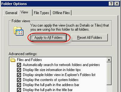 בחלון שנפתח (ראו בהמשך) בוחרים תצוגה (View), ואז לוחצים על הכפתור "החל על כל התיקיות" (Apply to All Folders).