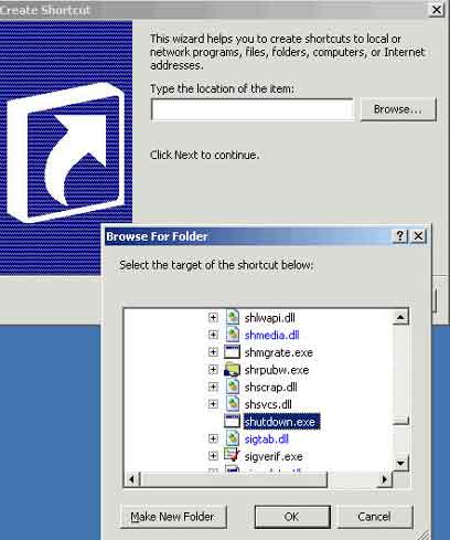 בחלון החדש שנפתח, יש ללחוץ על כתפור "עיון" (Browse) ואז לבחור בקובץ shutdown.exe, אשר נמצא בתיקיית system32, אותה תוכלו למצוא בתיקייה שבה התקנתם את מערכת ההפעלה Windows (לרוב התיקייה נקראת Windows).
